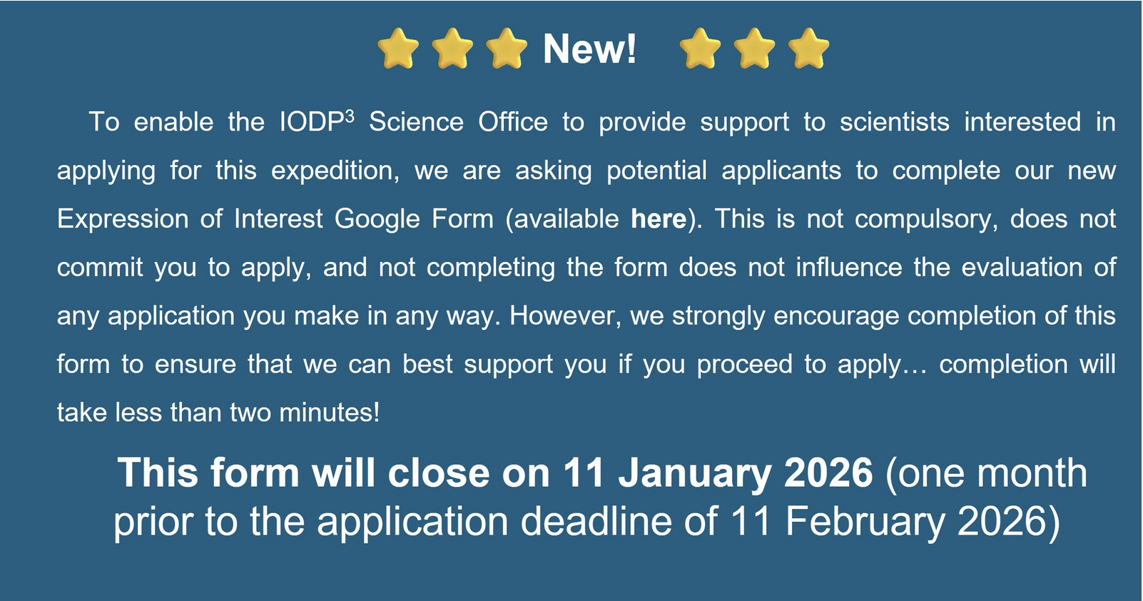 | For more information, please read the full call for participation. The Scientific Prospectus can also be found on the Expedition 506S Expedition Page. |